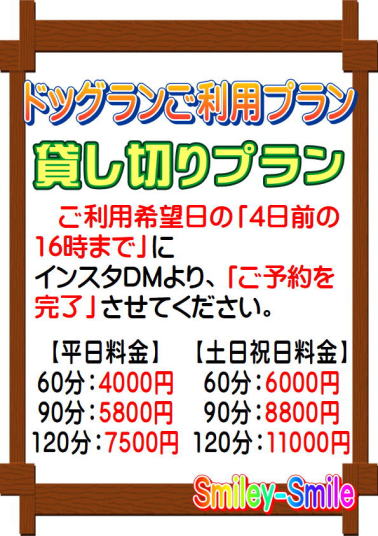 「ドッグラン」に関しては、「ご希望日の2日前の17時までにご予約」をしていただく必要があります。