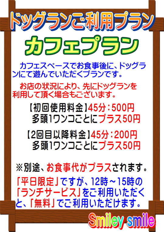 ・料金には「お食事代金&ドリンク代金&ドッグラン代金」が含まれています。